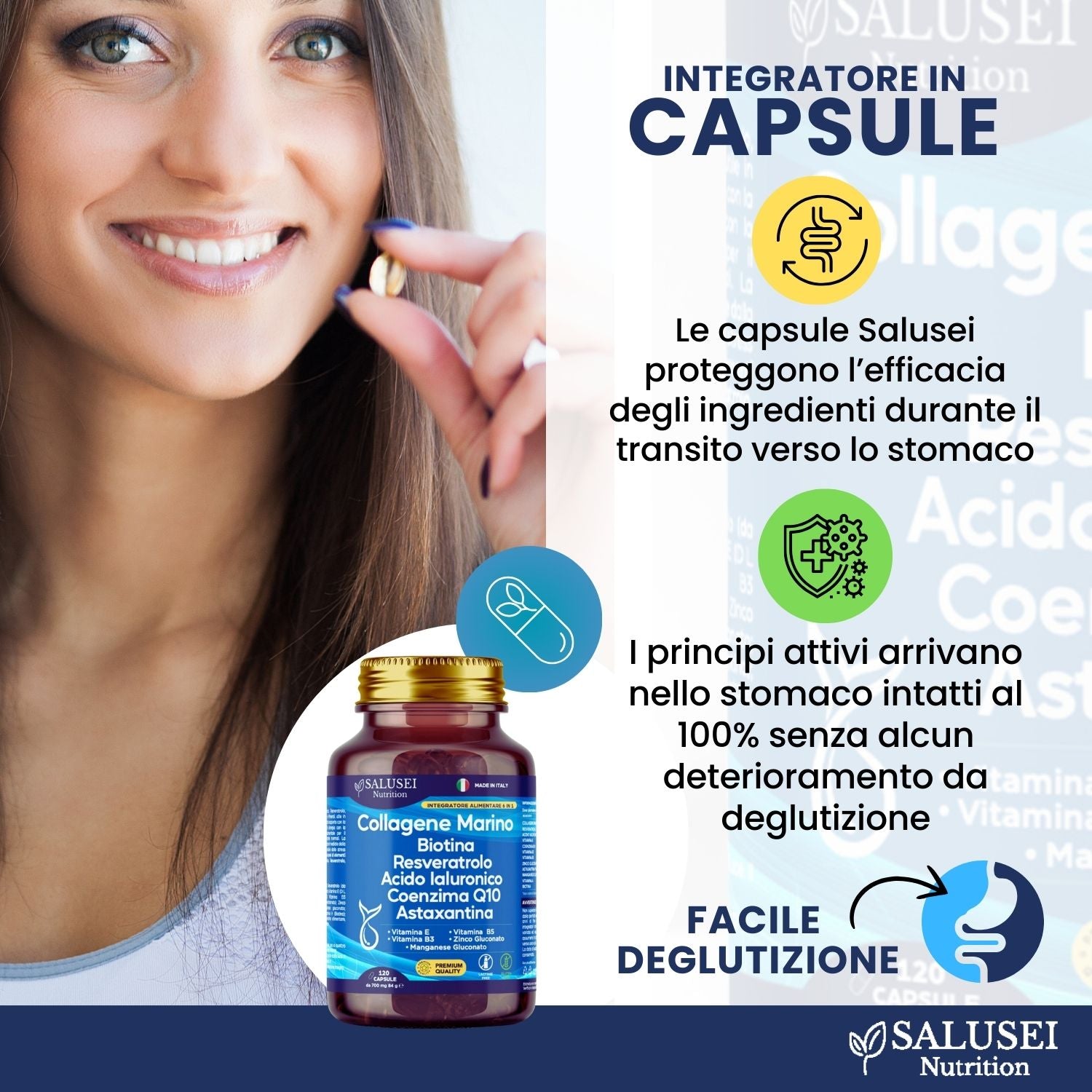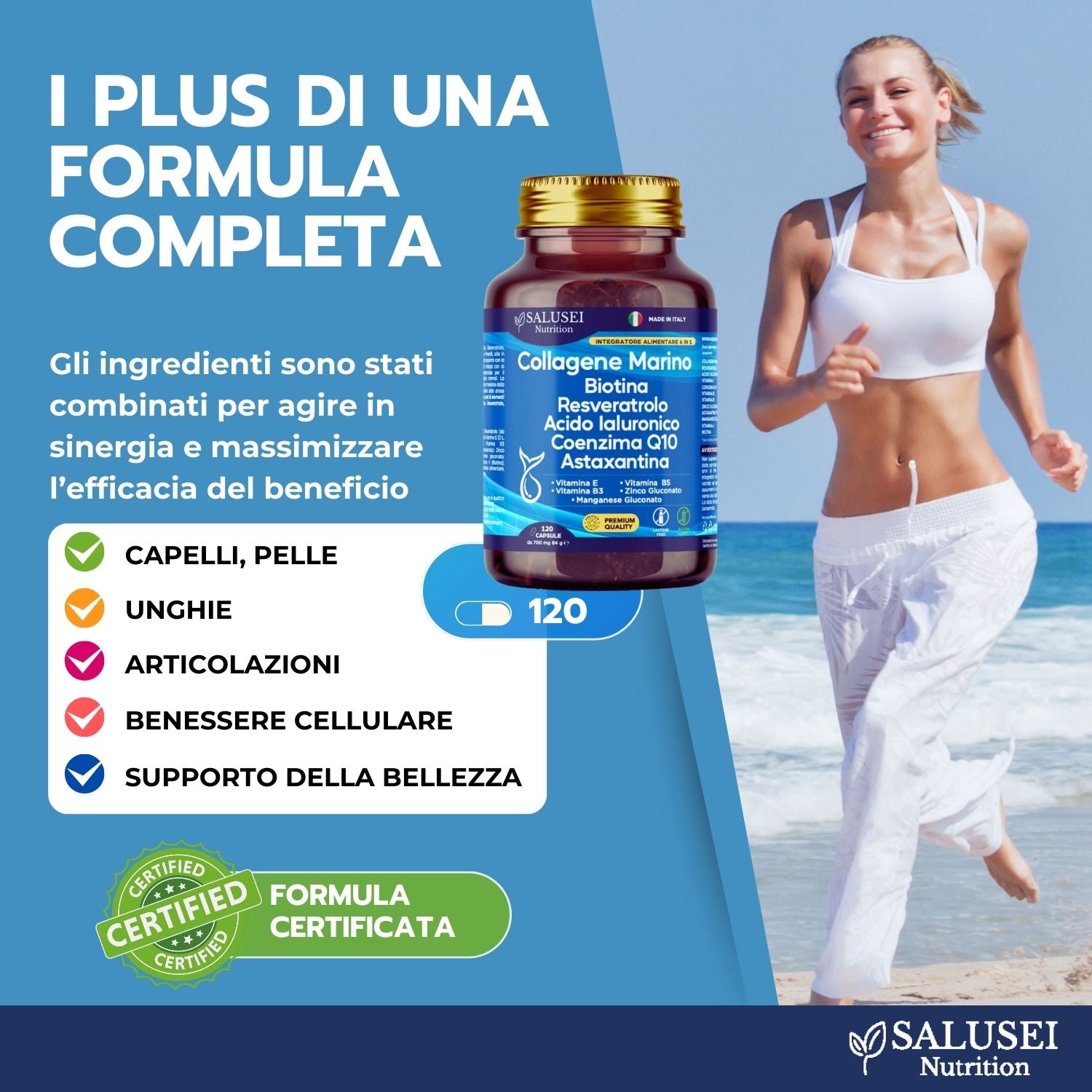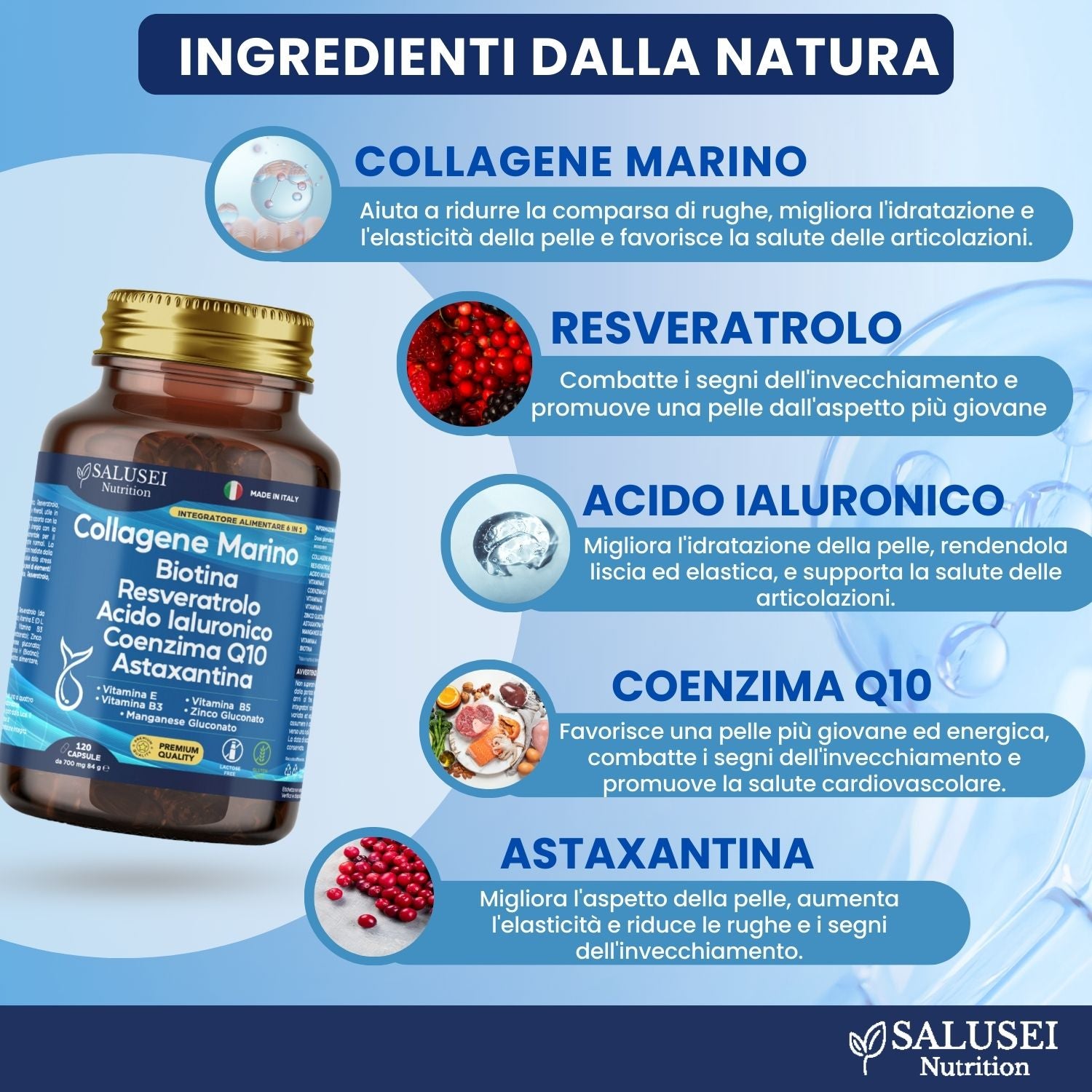 🥇 QUALITÀ PREMIUM MADE IN ITALY, SICURA E GARANTITA - Realizzato interamente in Italia, il nostro prodotto rispetta i più alti standard di qualità e sicurezza. Ogni ingrediente è selezionato con cura per garantire qualità e sicurezza. Ideale per chi cerca un integratore che offra risultati concreti, il nostro marchio rappresenta un impegno verso la trasparenza e l’eccellenza. Un investimento sicuro per il tuo benessere e la tua bellezza. SALUSEI 120 Capsule Integratore Collagene Marino 1100 Mg, Acido Ialuronico, Resveratrolo, Vitamine A, E, B3, B5, Coenzima Q10, Astaxantina, Zinco, Biotina Capelli E Unghie Supporto Per Pelle Pura